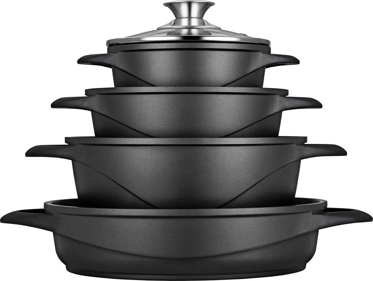 Deze prachtige pannenset van het merk Smile geeft iedere keuken een upgrade. De pannen zijn namelijk geschikt voor iedere kookplaat, waaronder inductie, gas en elektrisch. Ook wanneer jij veranderd van huis of keuken, kun jij deze pannen dus gewoon blijven gebruiken. Het zwarte materiaal en de glazen deksels zorgen voor een luxe en stijlvolle uitstraling, welke kleur jouw keuken ook is. Naast het mooie uiterlijk zijn de pannen ook nog eens van topkwaliteit; ze zijn allen voorzien van een anti-aanbaklaag, roestvrij stalen knoppen en dikke wanden voor een gelijkmatige warmteverdeling. De perfecte pannenset dus om in te koken, frituren, stoven óf braden.